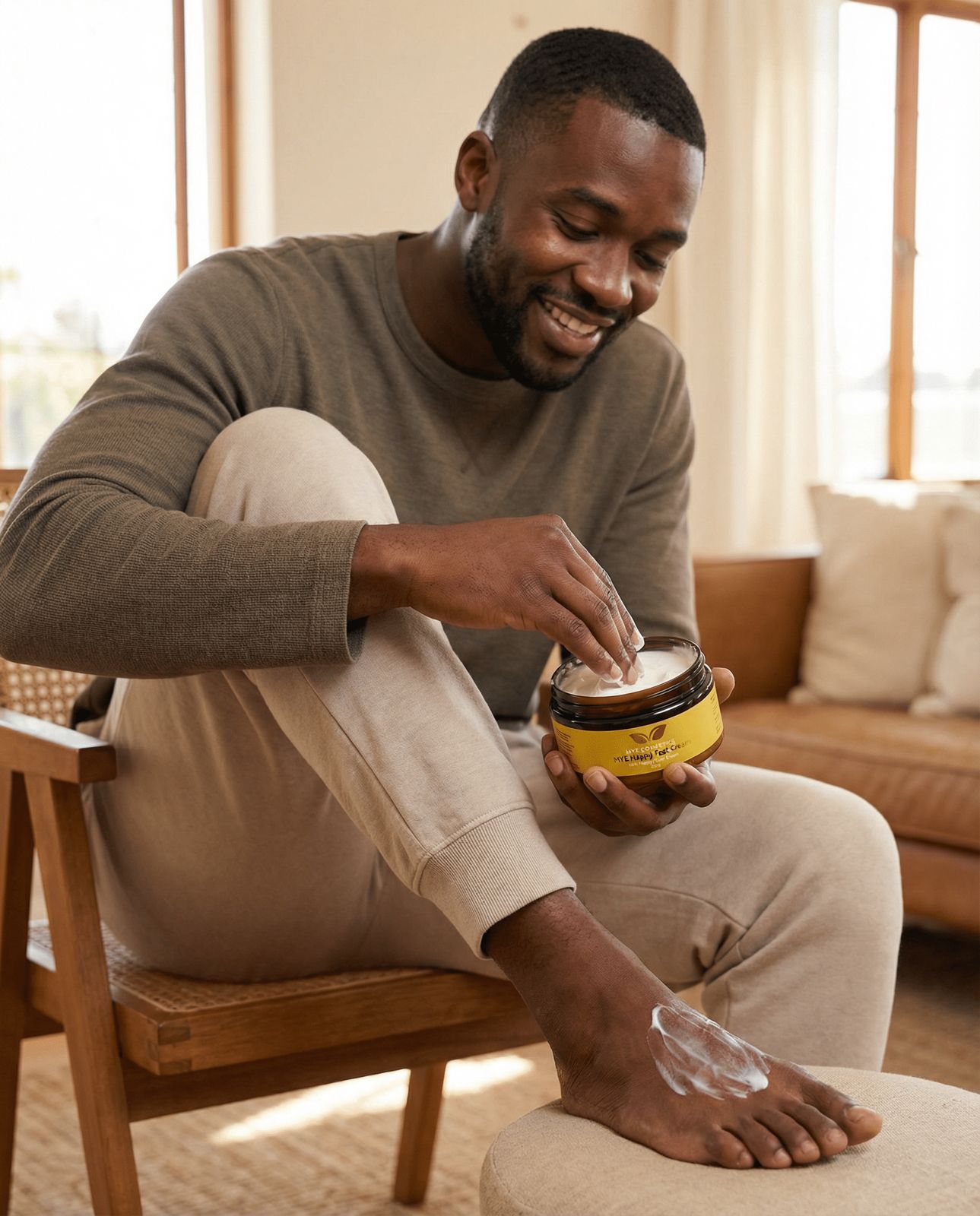 Distilled Water, Aloe Vera, Shea & Cocoa Butter, Almond & coconut oils, glycerin, E-wax, beeswax, salicylic Acid, Urea, green tea extract, Vitamin E , Tea Tree EO, menthol, EDTA, Preservative.